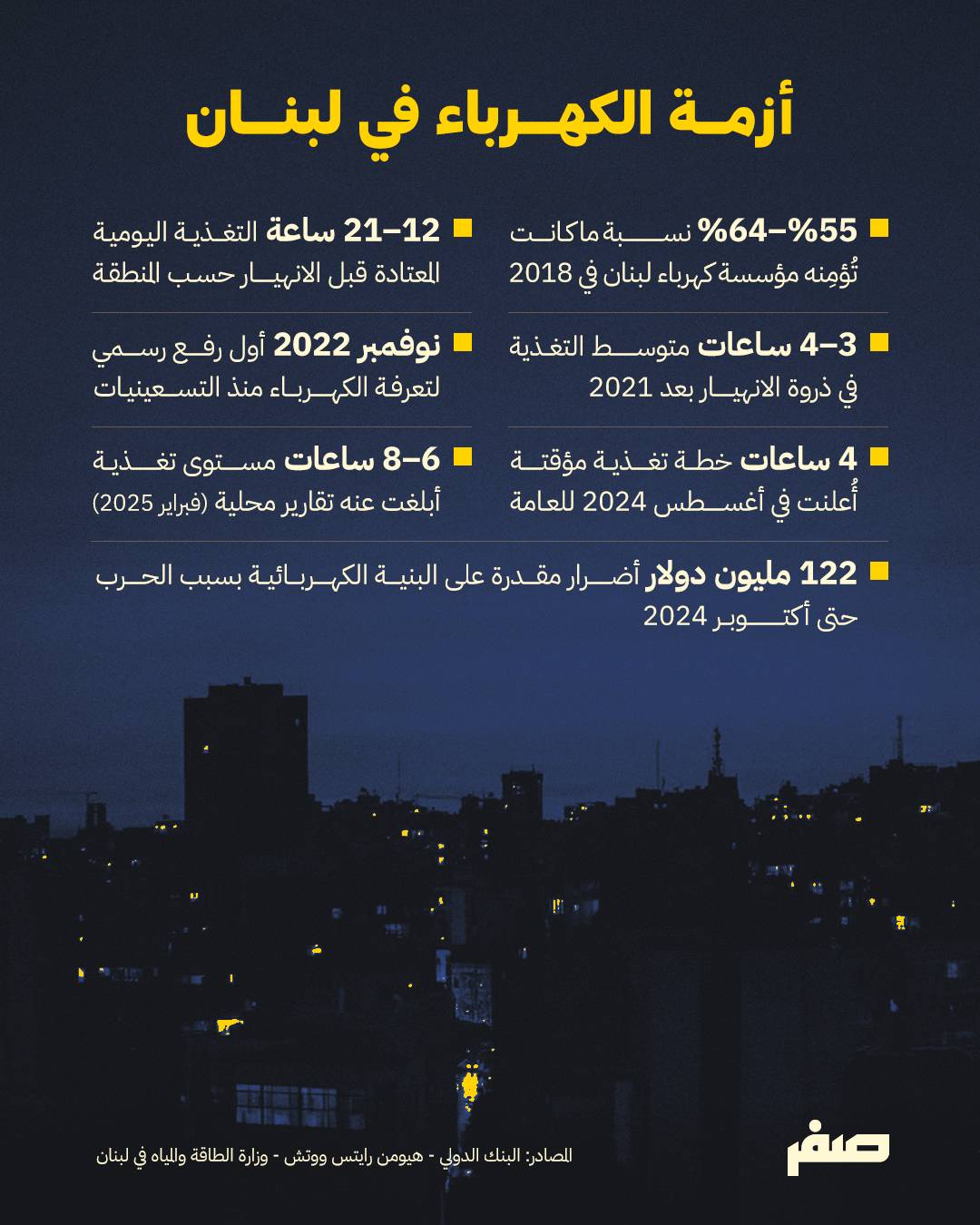 وتشير منظمة هيومن رايتس ووتش الحقوقية إلى أن الدولة اللبنانية لم تعد قادرة منذ عام 2021 على توفير أكثر من 1 إلى 3 ساعات كهرباء يومياً، فيما وصل التقنين في بعض الفترات إلى نحو 22 ساعة قطع يومياً، وفق بيانات المعهد اللبناني لدراسات السوق.