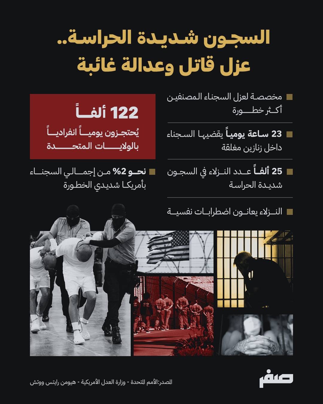 وتفيد بيانات حقوقية، من بينها تقرير هيومن رايتس ووتش حول سجون “السوبرماكس”، بأن نسباً مرتفعة من نزلاء هذه السجون يعانون من اضطرابات نفسية، في ظل بيئات احتجاز تفتقر في بعض الحالات إلى الحد الأدنى من الشروط الصحية.