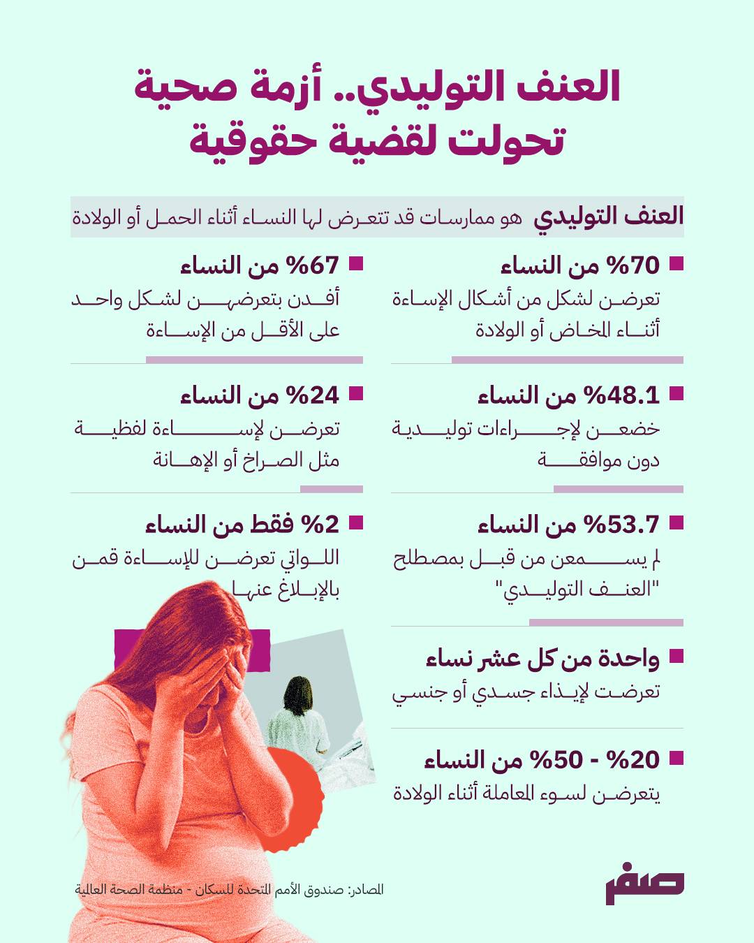 وتشير تقارير منظمة الصحة العالمية إلى أن إساءة معاملة النساء أثناء الولادة تمثل مشكلة صحية وحقوقية عالمية، وليست ظاهرة محصورة في منطقة بعينها. وتقدّر المنظمة أن نحو امرأة من كل ثلاث نساء حول العالم تتعرض لشكل من أشكال سوء المعاملة أثناء الولادة، بما يشمل الإهمال أو الإجراءات الطبية القسرية أو المعاملة المهينة والإساءة اللفظية أو الجسدية. وتؤكد المنظمة أن هذه الانتهاكات قد تخلّف آثارًا صحية ونفسية طويلة الأمد، كما تُضعف ثقة النساء في الأنظمة الصحية وقد تدفع بعضهن إلى تجنب الولادة في المؤسسات الطبية، ما يهدد الجهود العالمية الرامية إلى خفض وفيات الأمهات.