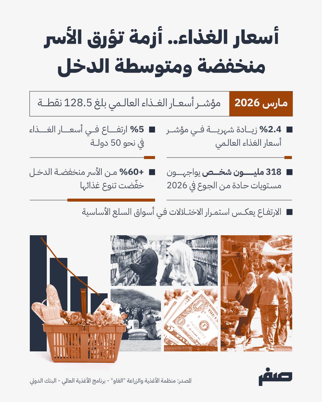 وفي حديثه لـ”صفر”، قال أرشيد إن ارتفاع مؤشر الغذاء العالمي إلى 128.5 نقطة في مارس 2026 يعكس استمرار هذه الضغوط، خاصة مع تأثير الجفاف في بعض مناطق الإنتاج الزراعي، ما أدى إلى تراجع صادرات الذرة والسكر.