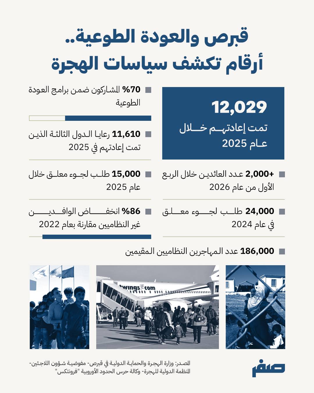تشير بيانات وزارة الهجرة والحماية الدولية في قبرص إلى أن عام 2025 شهد إعادة 12,029 مهاجرا، وهو أعلى رقم تسجله البلاد على الإطلاق، ومن بين هؤلاء، جرى تنفيذ 11,610 عملية إعادة لمواطنين من دول ثالثة، فيما تم احتساب الإجمالي مع عمليات إعادة التوطين ضمن الرقم النهائي، وتوضح الحكومة أن 70 % من هذه الحالات تمت عبر برامج العودة الطوعية المدعومة، بالتعاون مع الاتحاد الأوروبي، ما يعكس تحولا واضحا في السياسة القبرصية نحو تشجيع العودة بدل الترحيل المباشر.