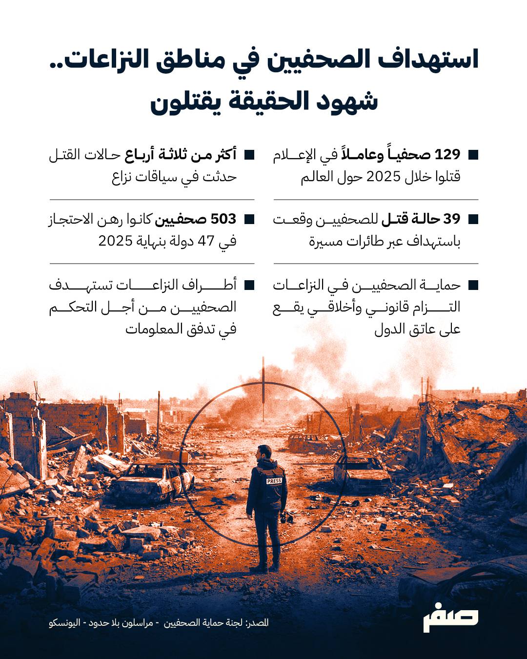 وتكشف هذه الأرقام تحولاً خطيراً في طبيعة المخاطر التي تواجه الصحفيين؛ فالمسألة لم تعد مقتصرة على المخاطر الملازمة للتغطية الميدانية، بل باتت تشمل أنماطاً أكثر مباشرة وفتكاً من الاستهداف.