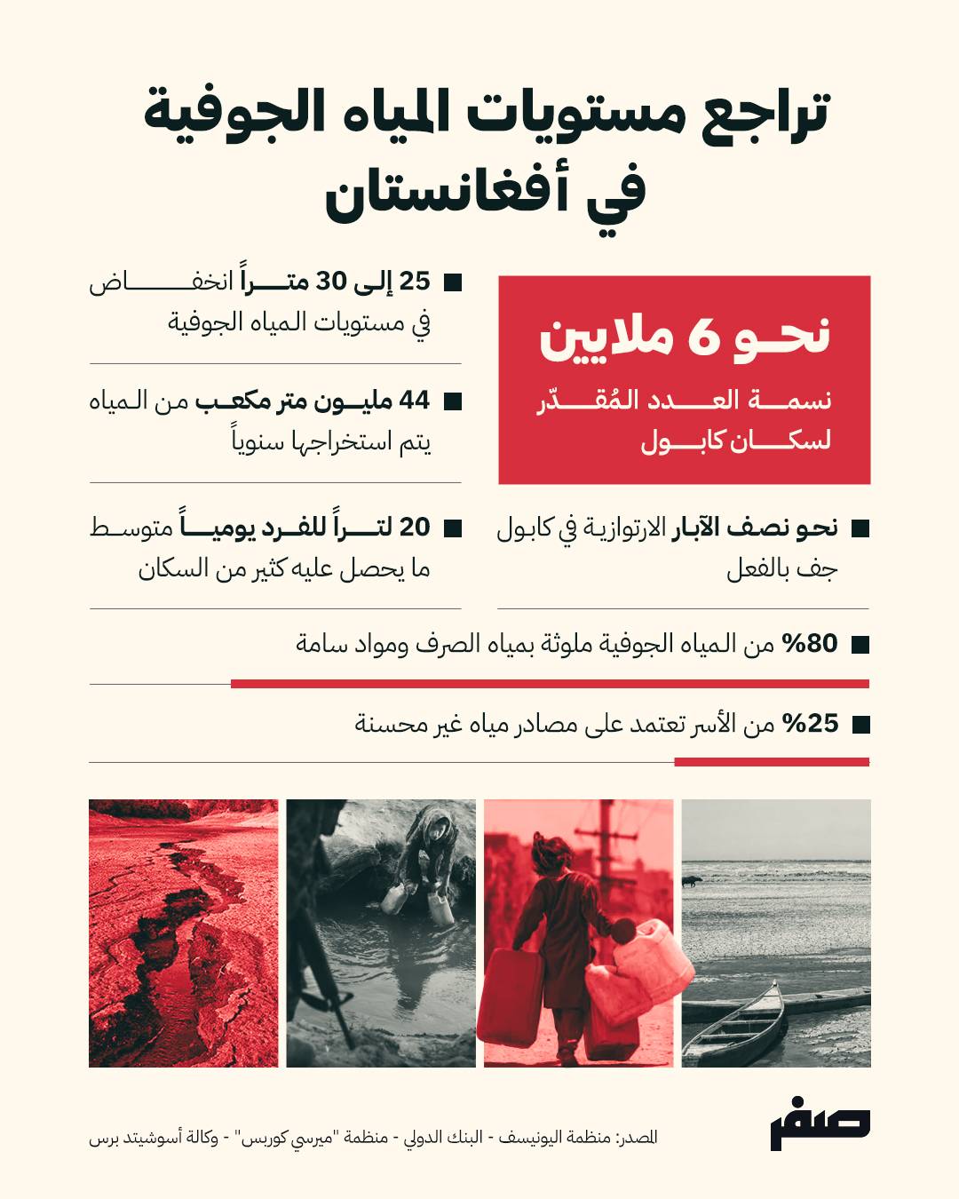 وحذرت المنظمة من أن كابل قد تتجه إلى نضوب حاد في طبقاتها المائية خلال السنوات المقبلة إذا لم تحدث تغييرات واسعة في إدارة المياه والاستثمار في البنية التحتية.