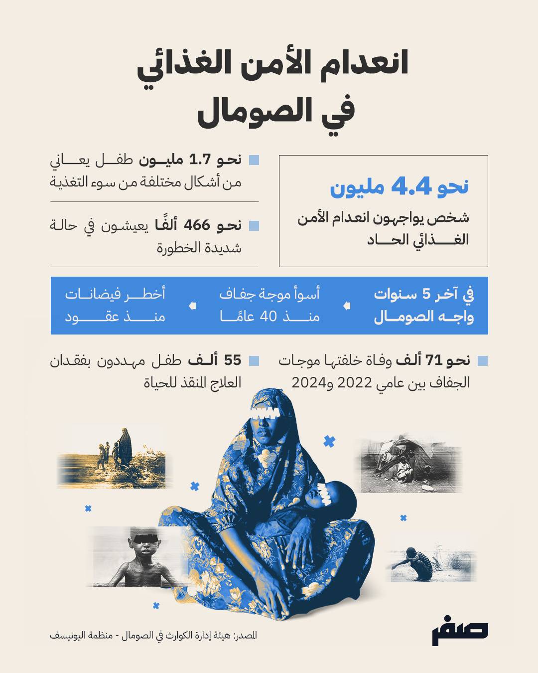 مع بداية عام 2026، أشارت تقديرات اللجنة الدولية للصليب الأحمر إلى أن نحو 6.5 مليون شخص في الصومال يواجهون مستويات حادة من انعدام الأمن الغذائي، تضعهم على شفا حافة المجاعة، مع استمرار تأثير الجفاف على مصادر المياه، وانهيار الإنتاج الزراعي، وارتفاع أسعار الغذاء إلى مستويات غير مسبوقة، ويوازي هذا الرقم أكثر من ربع سكان البلاد، ويقع في نطاق ما تصنفه المنظمات الإنسانية بأنه أزمة غذائية حادة تتطلب تحركًا عاجلًا لإنقاذ الأرواح.