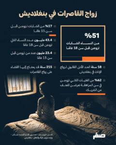 وتفيد منظمة الأمم المتحدة للأطفال “اليونيسف”، بأن بنغلاديش تضم اليوم 43.4 مليون فتاة وامرأة تزوجن قبل سن 18، منهن 23.4 مليون قبل سن 15، ما يضع البلاد ضمن أعلى عشر دول عالميًا من حيث انتشار الظاهرة.