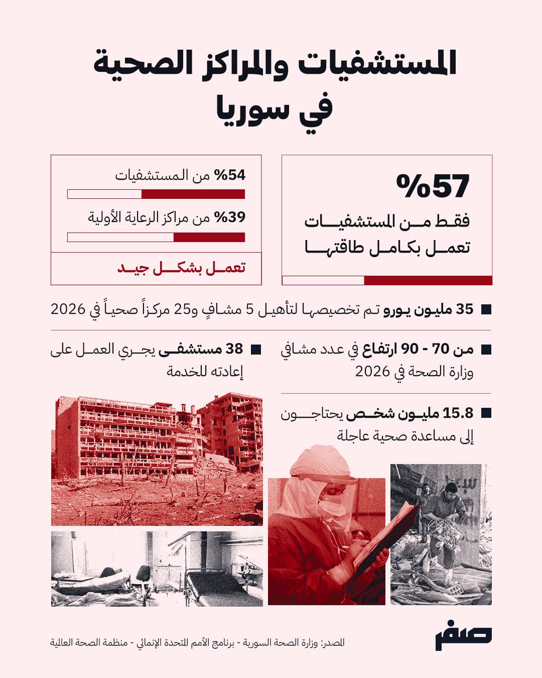وفي أبريل 2026 تحدثت وكالة سانا عن ارتفاع عدد المشافي التابعة لوزارة الصحة من 70 إلى 90 مشفى، والعمل على إعادة تفعيل 38 مشفى خارج الخدمة، كما وقّعت وزارة الصحة مع برنامج الأمم المتحدة الإنمائي في فبراير 2026 مذكرة تفاهم بقيمة 35 مليون يورو لإعادة تأهيل خمسة مشافٍ و25 مركزاً صحياً.