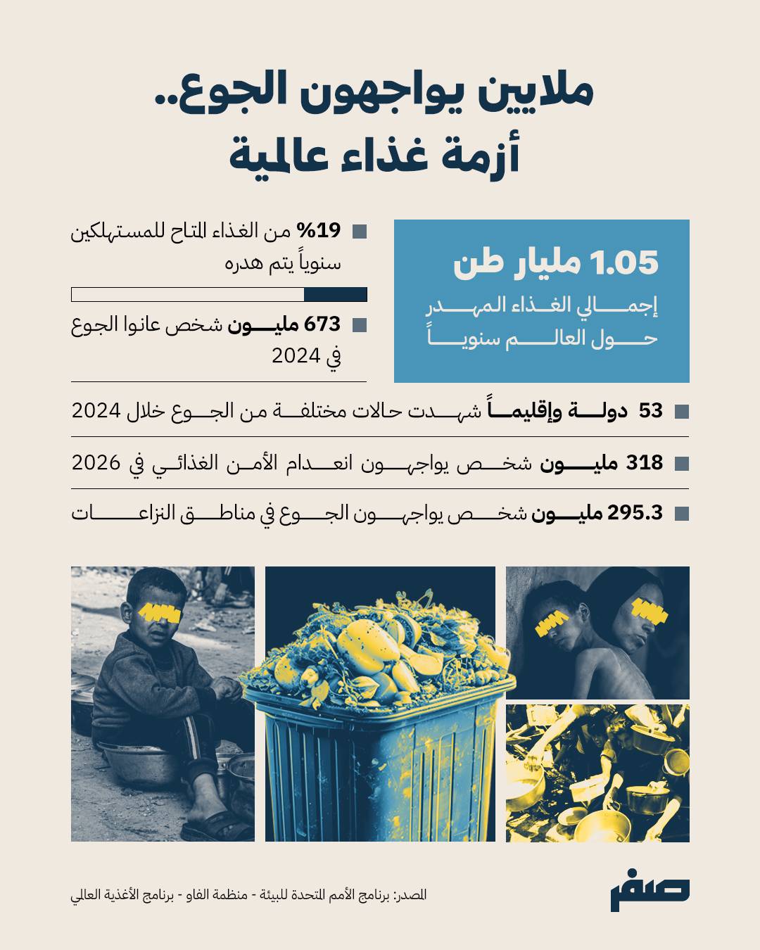وتكشف هذه الأرقام التناقض الأكثر قسوة في النظام الغذائي العالمي، ففي الوقت الذي يُهدر فيه العالم أكثر من مليار طن من الغذاء في عام واحد، لا يزال مئات الملايين يعانون الجوع المزمن، في حين يرزح نحو 295.3 مليون شخص تحت وطأة الجوع الحاد في مناطق الأزمات.