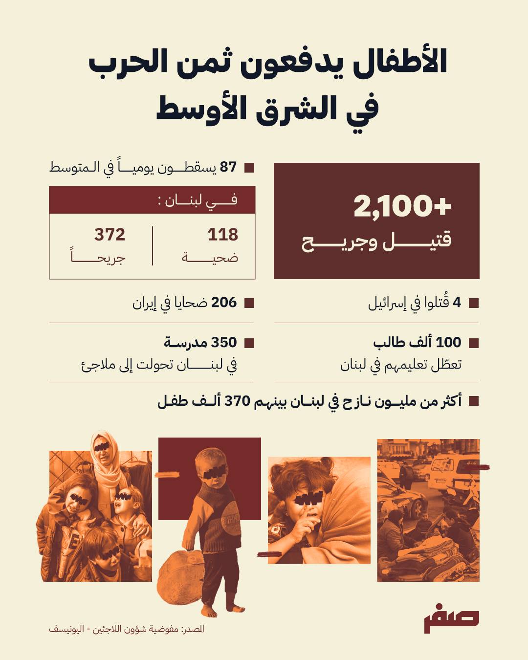 وحذّرت منظمات دولية من خطورة الحرب على الأطفال في الشرق الأوسط، معتبرة أنها الفئة الأكثر هشاشة في المجتمعات والتي تدفع ثمناً لصراعات لم تكن سبباً في اندلاعها.