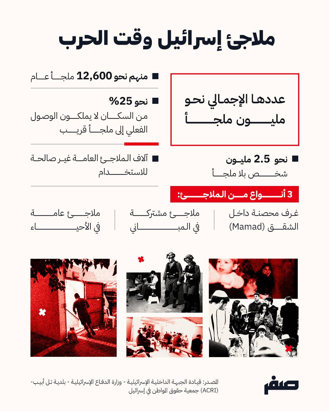 وفق بيانات قيادة الجبهة الداخلية الإسرائيلية (Israel Home Front Command) تمتلك إسرائيل شبكة واسعة من الملاجئ تقدر بنحو مليون ملجأ، تشمل غرفاً محصنة داخل الشقق السكنية، وملاجئ مشتركة في المباني، إضافة إلى آلاف الملاجئ العامة التي تديرها البلديات، وقد تطورت هذه البنية على مدى عقود نتيجة التهديدات الأمنية المستمرة، وأصبحت جزءًا أساسيًا من معايير البناء والتخطيط العمراني، بما يضمن الحد الأدنى من الحماية للسكان في المناطق الحضرية وغيرها.