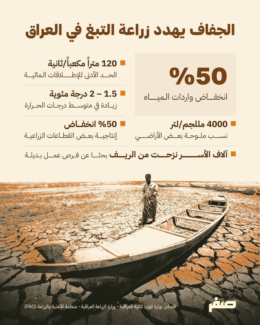 وفي السياق حذرت تقارير برنامج الأمم المتحدة الإنمائي من أن استمرار الجفاف وارتفاع درجات الحرارة قد يؤديان إلى تفاقم الأزمات الزراعية في العراق خلال السنوات المقبلة، وتشير هذه التقارير إلى أن بعض المحاصيل التقليدية، مثل التبغ، قد تختفي بالكامل من مناطق الوسط والجنوب إذا استمرت الظروف الحالية.