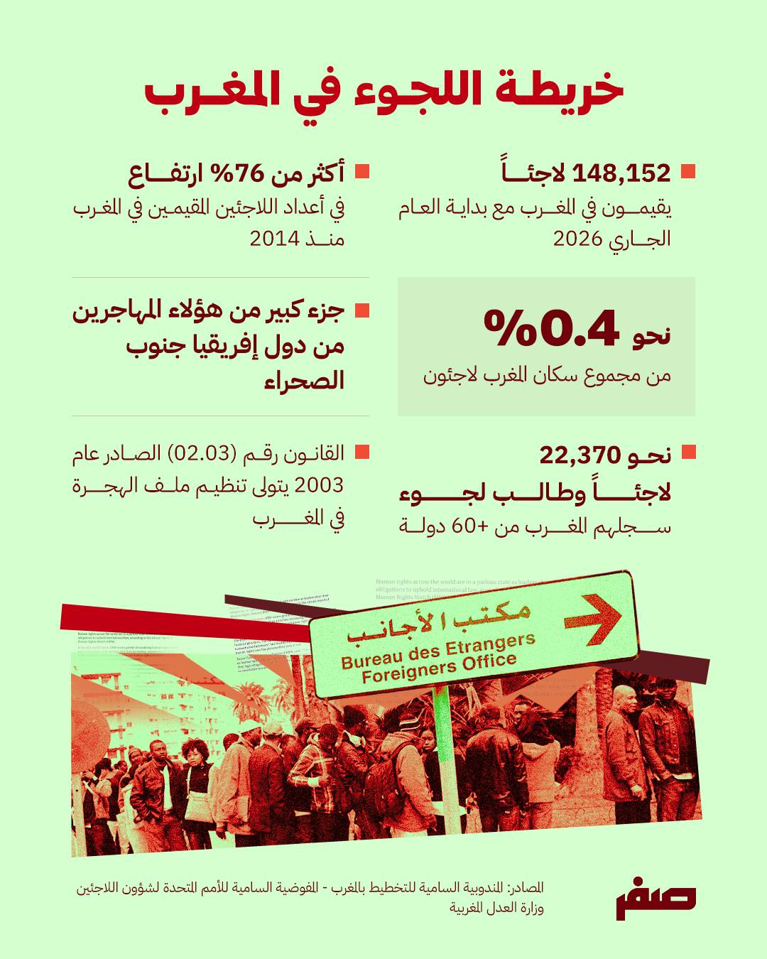 كما ذكرت المفوضية السامية للأمم المتحدة لشؤون اللاجئين أن المغرب سجل بحلول مارس 2026 نحو 22.370 لاجئ وطالب لجوء من أكثر من 60 دولة، بينهم لاجئون من سوريا وغينيا وساحل العاج والسودان ودول إفريقية أخرى.